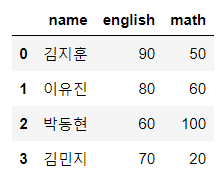 df = pd.DataFrame({'name' : ['김지훈', '이유진', '박동현', '김민지'],