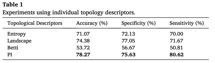 PI 방법은 정확도, 특이도, 민감도에서 모두 가장 우수한 성능을 보였으며, 특히 Betti number는 판별력이 거의 없는 것으로 나타났다. 이는 ADHD EEG에서 중요한 위상 특징이 단순한 생성 개수보다는 지속 시간(persistence)에 기반하고 있다는 점을 시사한다.