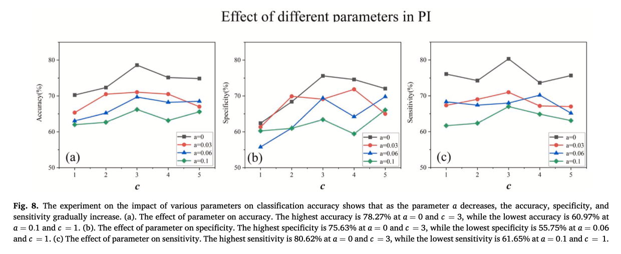 그 결과 a = 0, c = 3 조합이 가장 우수한 성능(정확도 78.27%, 민감도 80.62%, 특이도 75.63%)을 나타냈다.