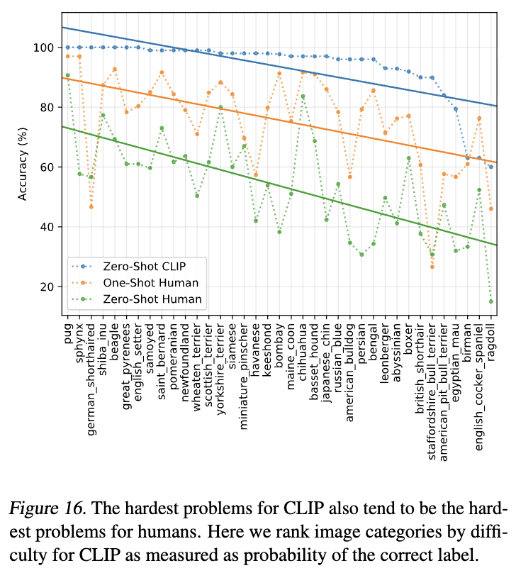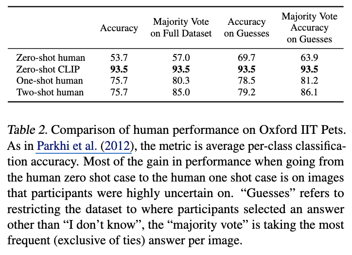 그렇다면 CLIP은 인간의 성능과 어떻게 비교될까? 연구진은 이를 알아보기 위해 Oxford IIT Pets 데이터셋(3669장, 37종 고양이/강아지 품종 분류)을 가지고 사람들을 대상으로 실험을 진행하였다.