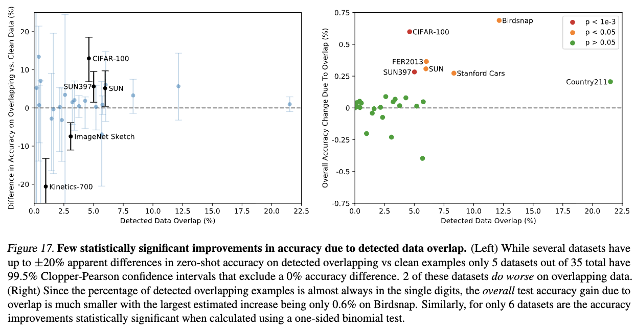 - 가장 큰 중복률은 Country211 데이터셋(21.5%)이었지만, 성능 차이는 0.2%에 불과했다.