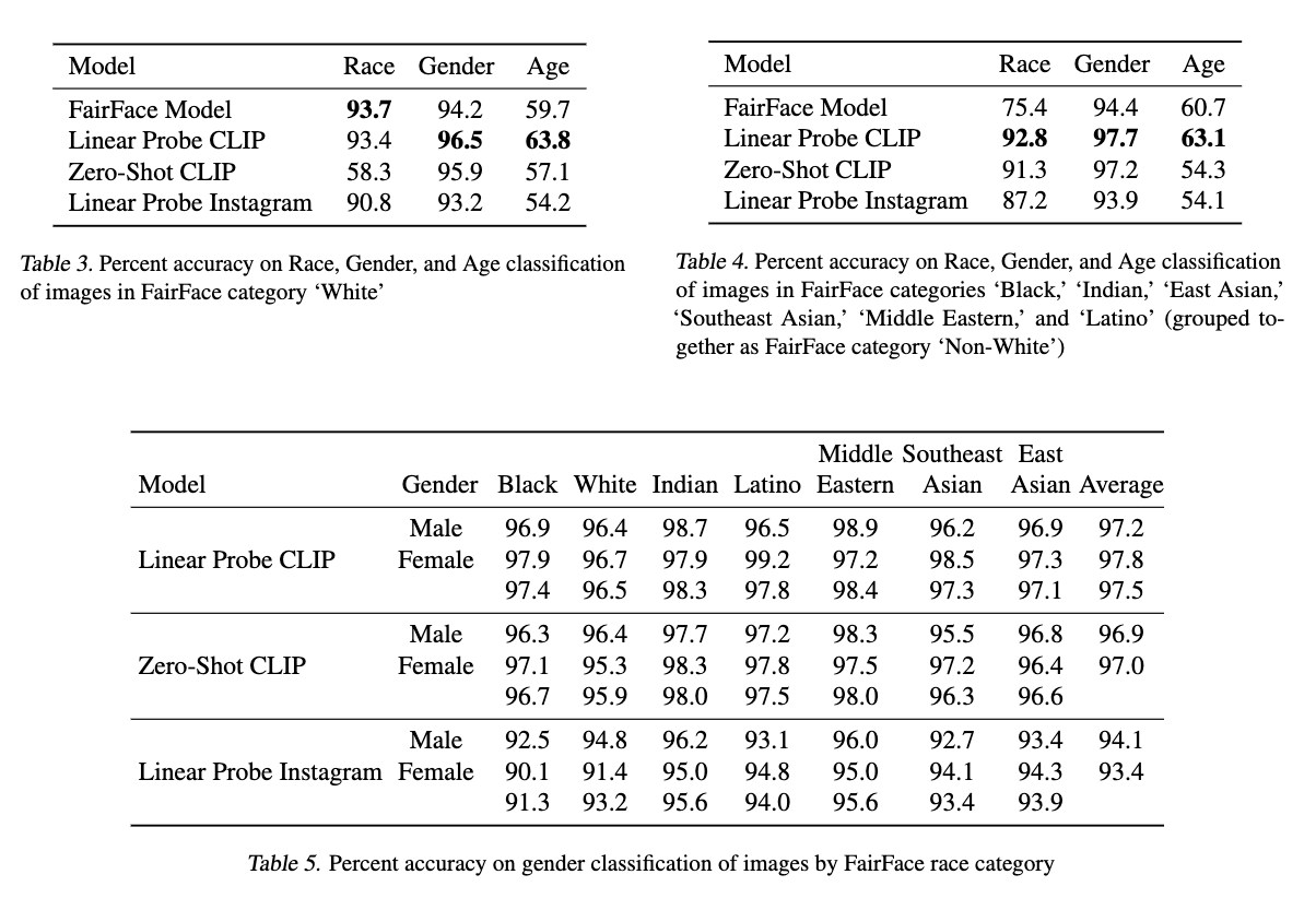 연구진은 CLIP의 사회적 편향(social bias)을 탐구하기 위해 FairFace 벤치마크를 비롯한 다양한 편향 평가를 수행했다.