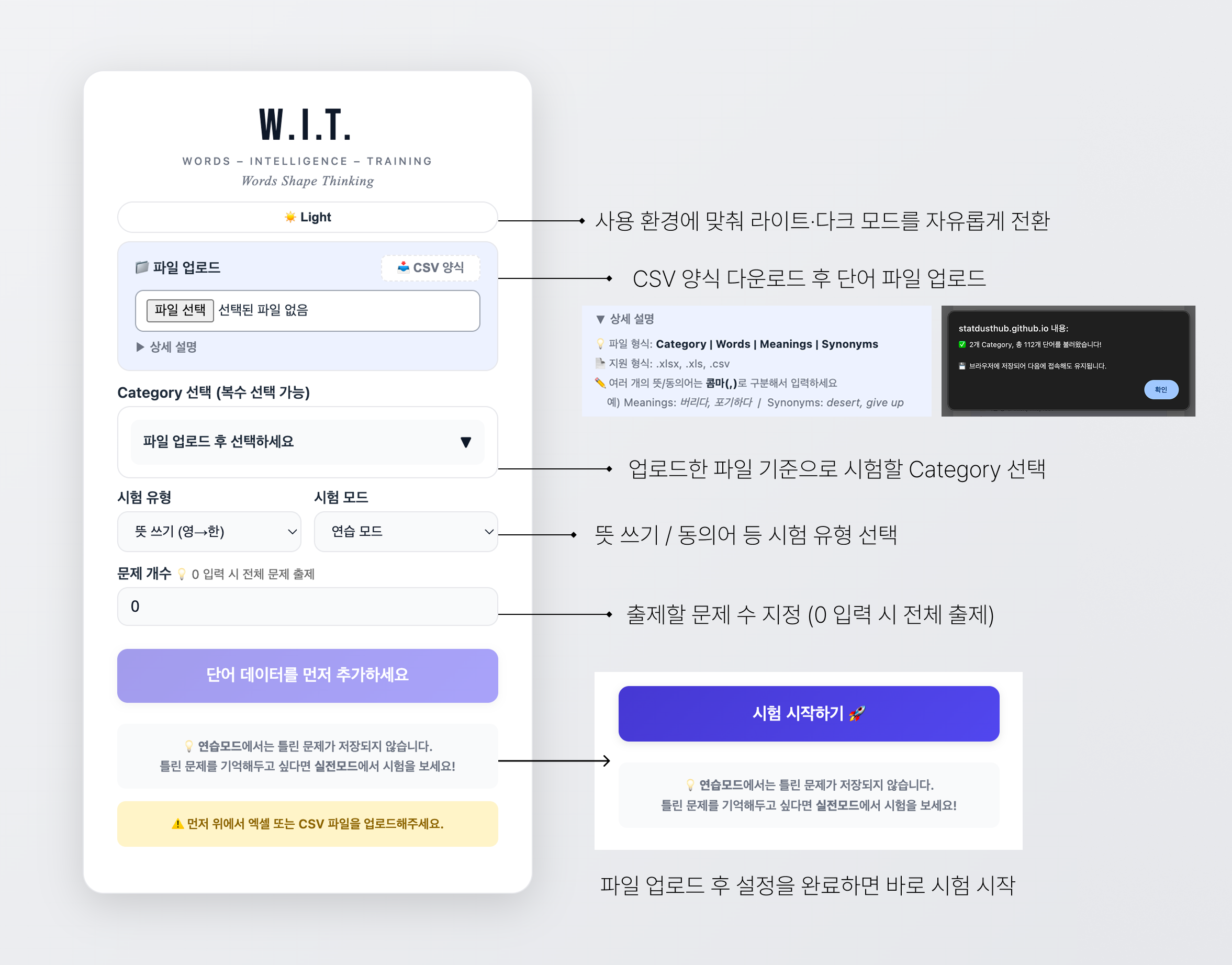 ์ํ ์ ํ์ ์โํ / ์โ์ ๋ ๊ฐ์ง๋ก ๊ตฌ์ฑ๋์ด ์์ผ๋ฉฐ, ํ์ต ๋ชฉ์ ์ ๋ฐ๋ผ ์ฐ์ต ๋ชจ๋์ ์ค์ ๋ชจ๋๋ฅผ ์ ํํ ์ ์๋ค. ์ฐ์ต ๋ชจ๋๋ ํ๋ฆฐ ๊ธฐ๋ก์ด ์ ์ฅ๋์ง ์์ ๋ถ๋ด ์์ด ์๊ธฐ ์ฐ์ต์ ํ์ฉํ ์ ์๊ณ , ์ค์ ๋ชจ๋๋ ์ค๋ต ๋จ์ด๊ฐ ์๋์ผ๋ก ๊ธฐ๋ก๋์ด ์ค์ ์ํ ๋๋น์ฉ์ผ๋ก ์ฌ์ฉํ ์ ์๋ค.