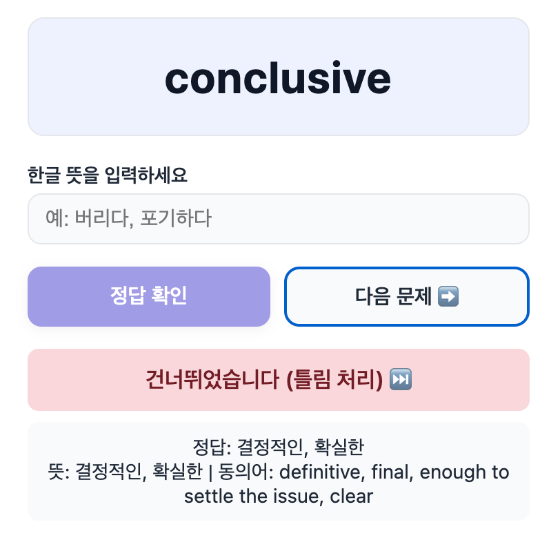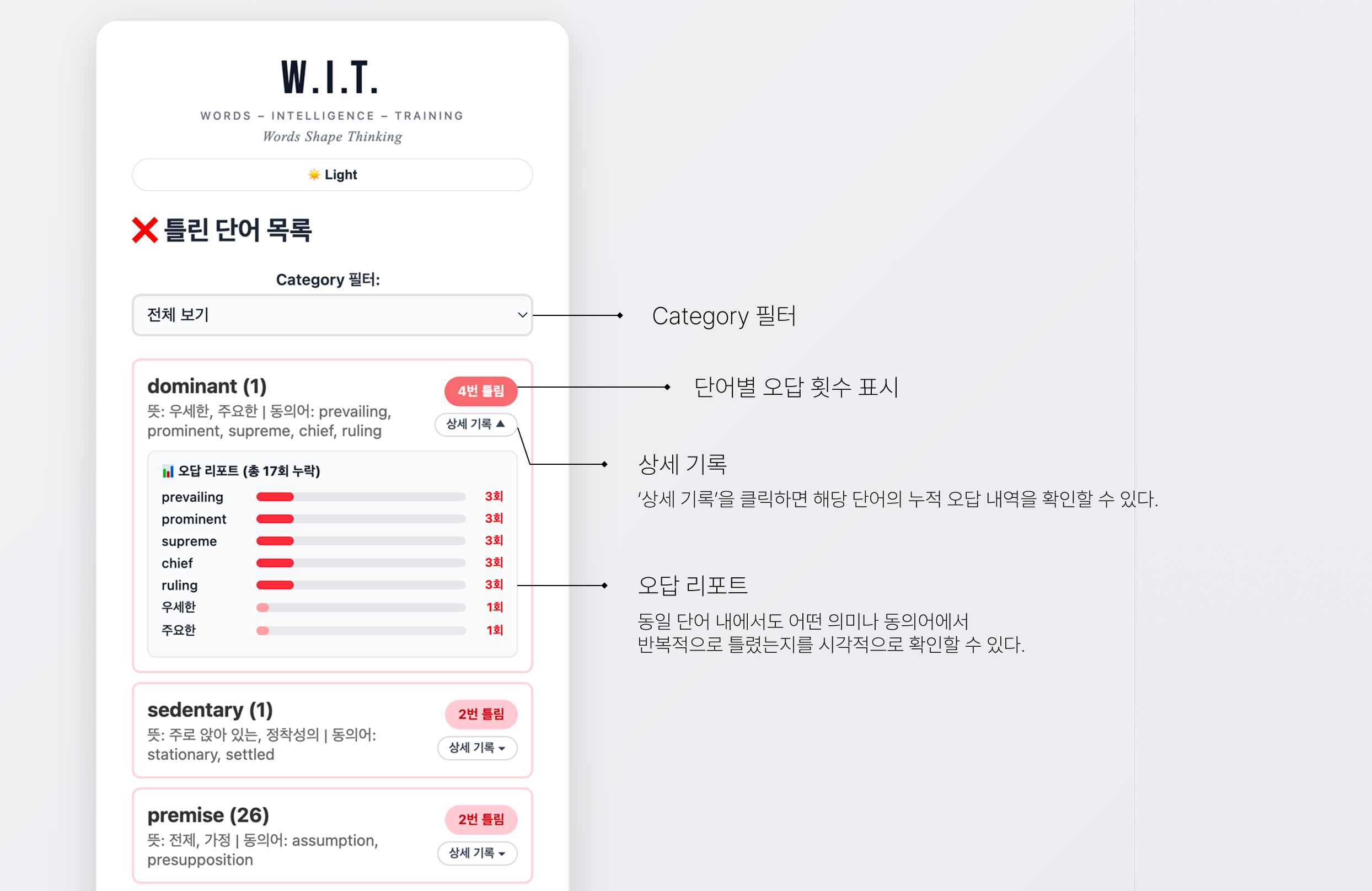 โ์์ธ ๊ธฐ๋กโ์ ํด๋ฆญํ๋ฉด ํด๋น ๋จ์ด์ ๋ป / ๋์์ด / ์ค๋ต ๋ด์ญ์ ํ์ธํ ์ ์๋ค. ์ด๋ค ์๋ฏธ๋ ํํ์์ ๋ฐ๋ณต์ ์ผ๋ก ์ค์ํ๋์ง ๋ฐ๋ก ์ ์ ์๋ค.