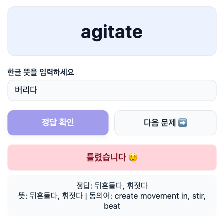 ๋ํ ํ์ต์ ์ด์ด๊ฐ๋ฉด์ ๋ฐ๋ณต์ ์ผ๋ก ํ๋ฆฌ๋ ๋จ์ด๋ค์ด ๊ณ์ ์์ด๋ ๊ฒ์ ์ฒด๊ฐํ๋ค. ์ด๋ค ๋จ์ด๋ฅผ ๋ช ๋ฒ ํ๋ ธ๋์ง ์๊ธฐ๋ก ๊ธฐ๋กํ๋ฉฐ ๊ด๋ฆฌํ๋ ๊ณผ์ ์ ์๊ฐ๋ณด๋ค ํฐ ๋ถ๋ด์ด์๊ณ , ์ง์ํ๊ธฐ๋ ์ด๋ ค์ ๋ค. ์ด ๊ฒฝํ์ ํตํด ์ค๋ต์ ์๋์ผ๋ก ๊ธฐ๋กํ๊ณ ๊ฐ์ธ์ ์ทจ์ฝ ๋จ์ด๋ฅผ ์ถ์ ํด ์ฃผ๋ ์์คํ
