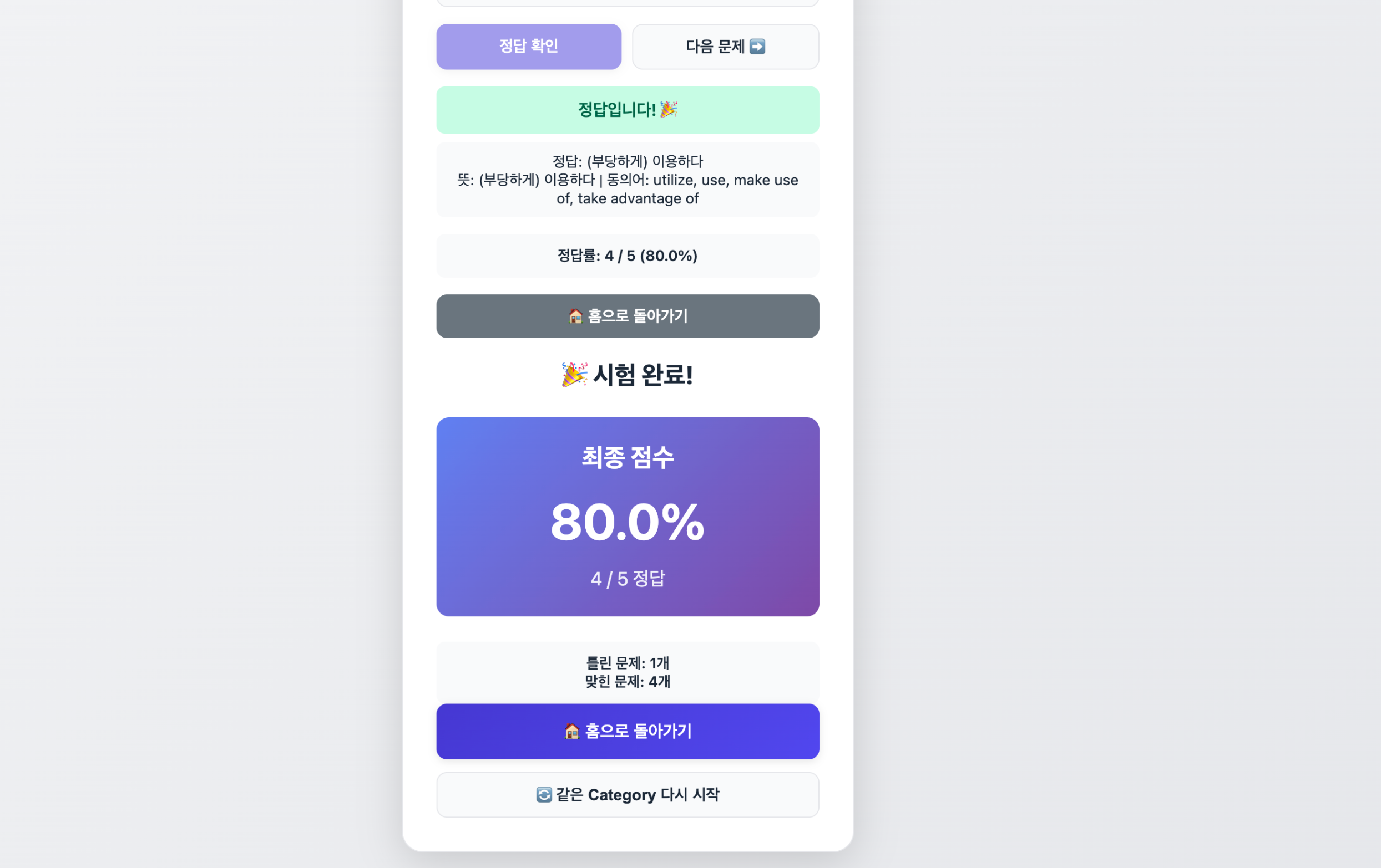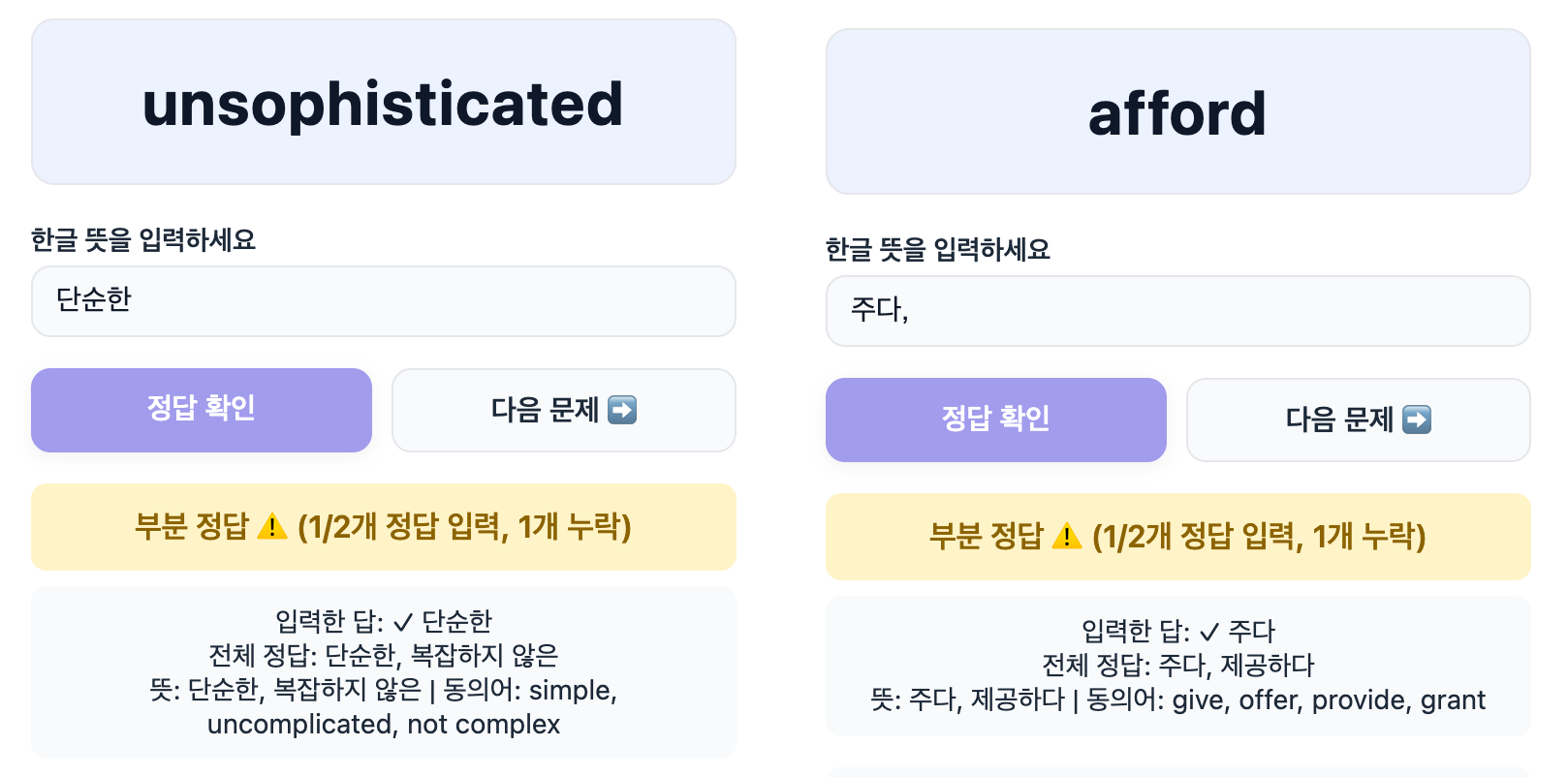 - Missed Details: ๋ปยท๋์์ด๋ณ ์ค๋ต ํ์ (์ด๋ค ์๋ฏธ์์ ์ผ๋ง๋ ํ๋ ธ๋์ง ๊ธฐ๋ก)