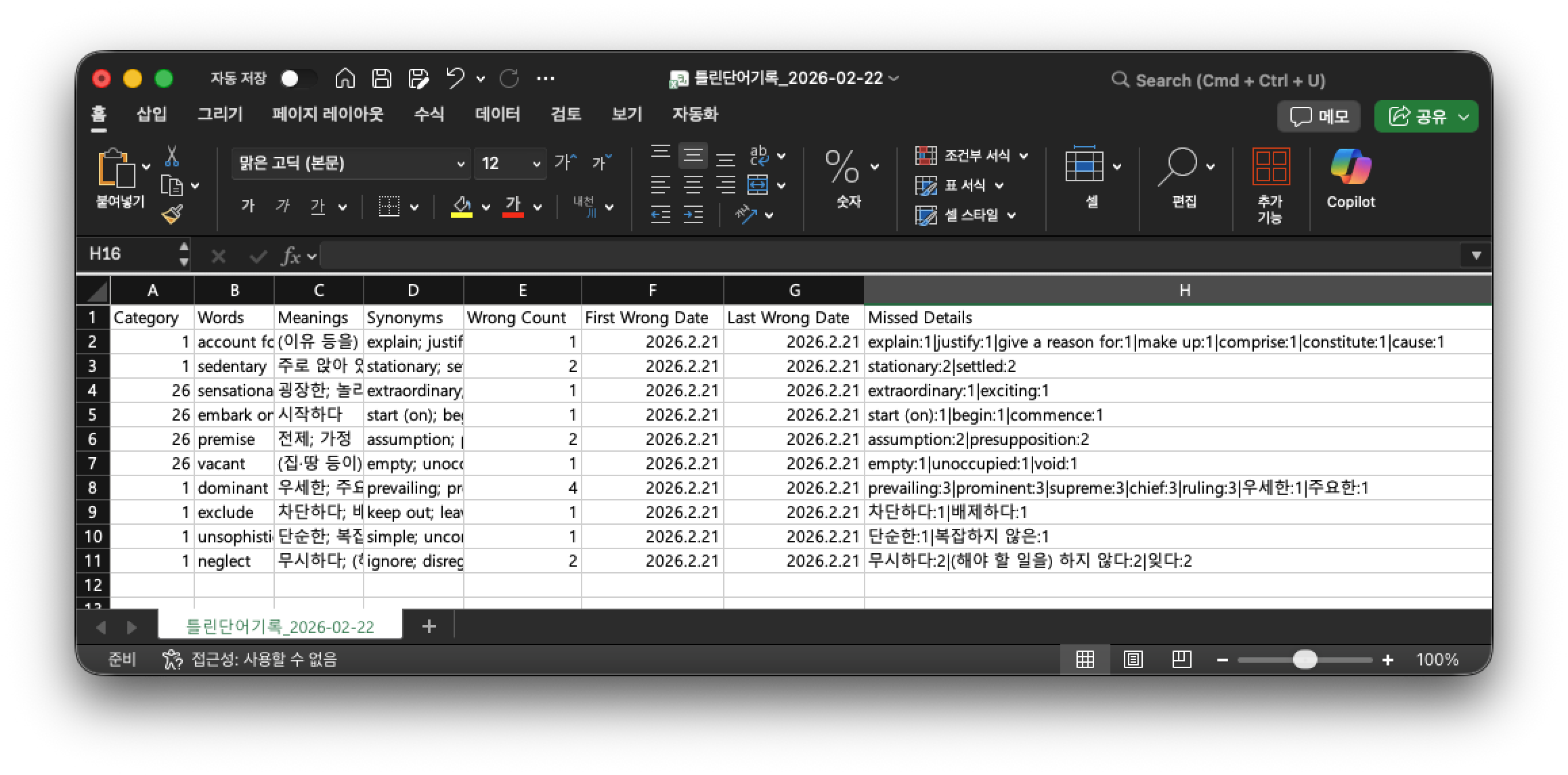 ํ๋ฆฐ ๋จ์ด ๊ธฐ๋ก์ ์์ ํ์ผ๋ก ๋ค์ด๋ก๋๋๋ฉฐ, ๋ค์ ์ ๋ณด๋ค์ด ํจ๊ป ์ ์ฅ๋๋ค.