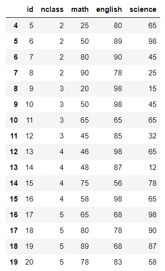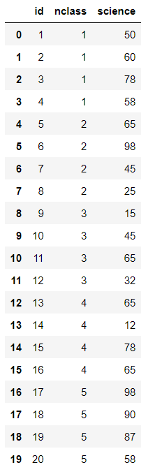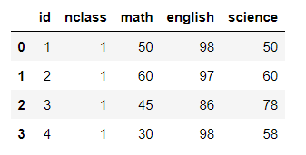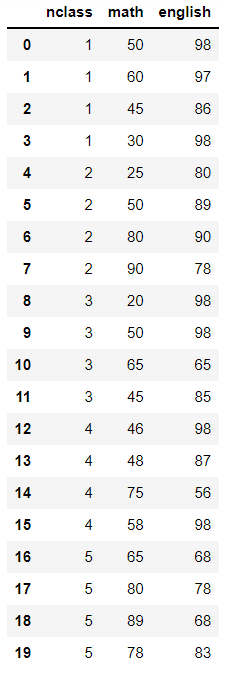 실습에 활용한 데이터는 exam.csv 파일이다. id(번호), nclass(반), math(수학 점수), english(영어 점수), science(과학 점수) 변수들로 이루어져있다.