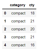 # 1. mpg 데이터의 11개 변수 중 일부만 추출해 분석에 활용하려 한다. mpg 데이터에서 category(자동차 종류), cty(도시 연비) 변수를 추출해 새로운 데이터를 만들어라. 새로 만든 데이터의 일부를 출력해 두 변수로만 구성되어 있는지 확인하라.