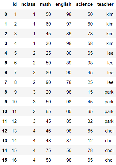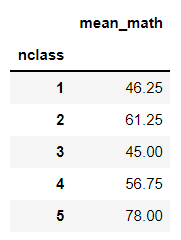 출력 결과는 위와 같다. 표의 맨 첫 번째 행이 무엇인가 이상해보인다. 이는 집단을 나타낸 변수명 nclass가 인덱스로 바뀌어 mean_math보다 밑에 표시되었기 때문이다. groupby( )의 기본값이 변수를 인덱스로 바꾸도록 설정되어 있기 때문에 그렇다. df.groupby( )에 as_index = False를 입력하게 되면 변수를 인덱스로 바꾸지 않는다.