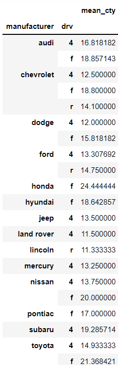 # 다음은 제조 회사별로 집단을 나누고 다시 구동 방식별로 나누어 도시 연비 평균을 구한 코드다.